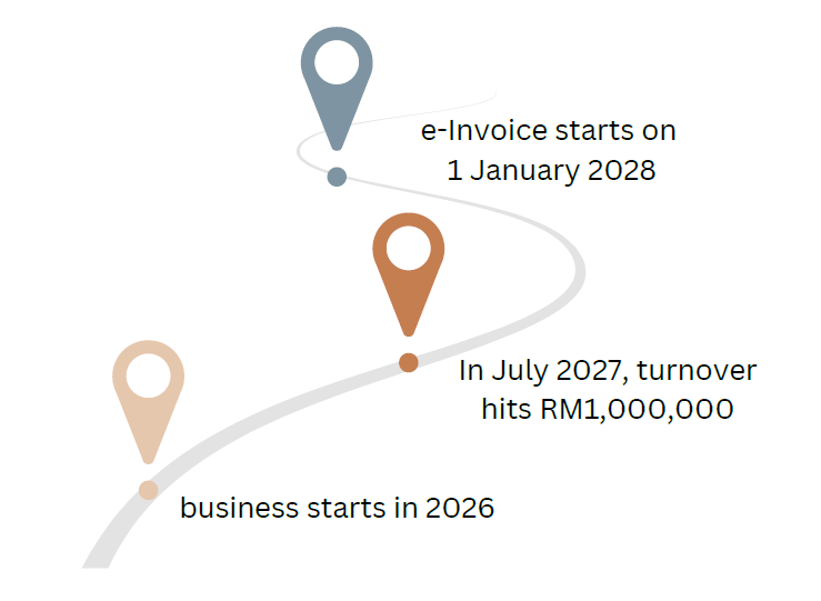 For MSME / PB new businesses starting from 2026 onwards, the business reaches RM1,000,000 turnover/revenue in the first year, e-Invoicing starts on 1 Jan 2027 or on the business commencement date, whichever is later.